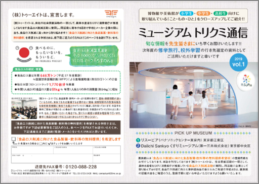 2019年1月、この『ミュージアム トリクミ通信』の裏面に食品ロス啓蒙記事を掲載。中学校、高等学校あわせて8,050校に送付し、食品ロスの現状や教育機関食品ロス削減に向けた理解と協力を訴えました。