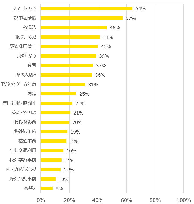 1位は「スマートフォン(64%)」で、2位は「熱中症予防(57%)」、3位「救急法(46%)」、4位「防災・防犯(41%)」となり、5位「薬物乱用禁止(40%)」と続きました。
