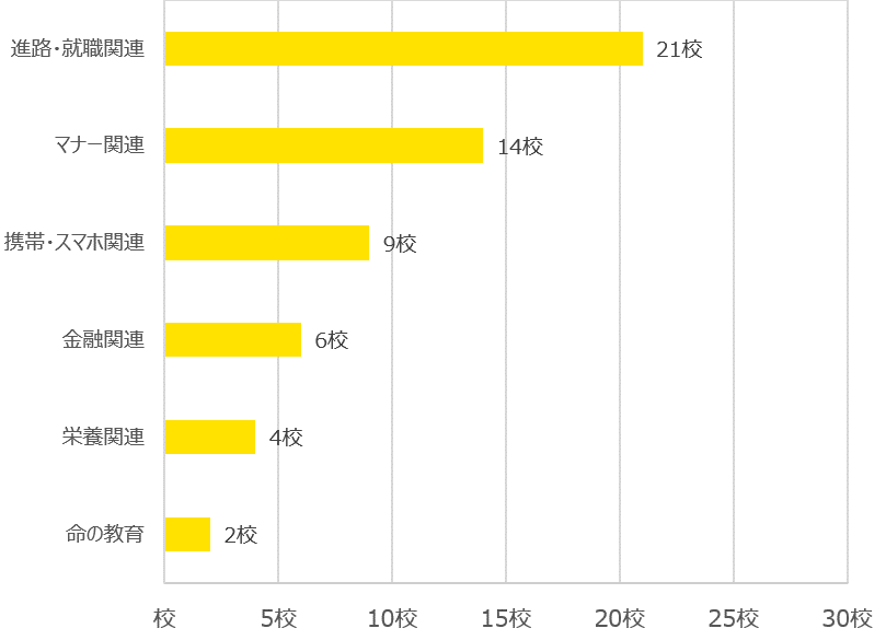 企業から講師を招いて出前授業を実施した内容で一番多いのは「進路・就職関連」で、次に「マナー関連」