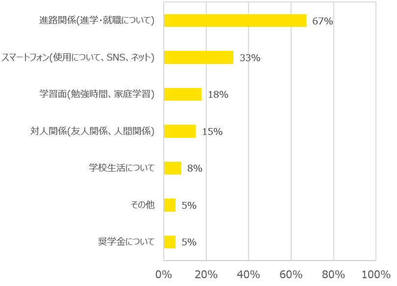 最も多かった回答は「進路関係(67%)」であり、回答数の過半数を占めた。3位の「学習面(18%)」 も合わせると全体の85%弱の回答数となり、大半の保護者が学業面=進学・就職・学習に対する不安を抱えている事が窺えます。