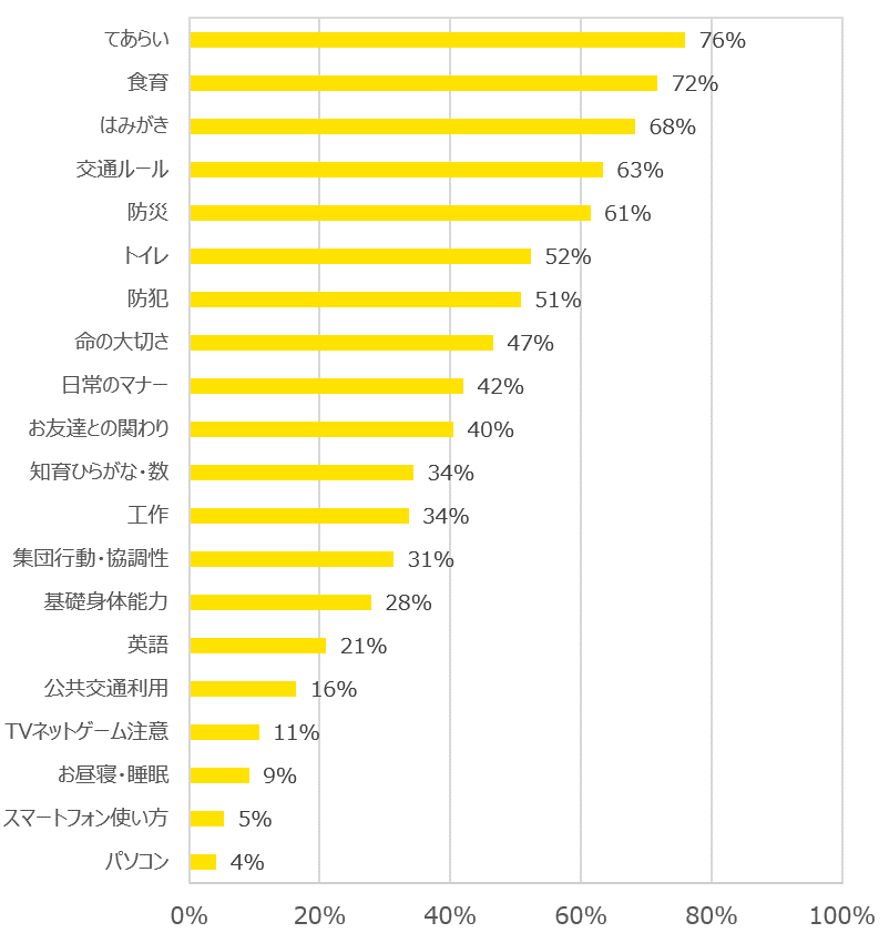 1位は「てあらい(76%)」で、2位は「食育(72%)」、3位「はみがき(68%)」、4位「交通ルール(63%)」となり、5位「防災(62%)」、6位「トイレ(52%)」と続きました。