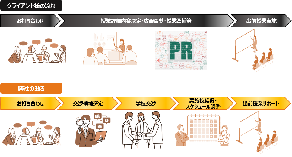 弊社で出前授業実施に向けて進めていく場合の基本的なフローを下記に紹介させていただきますので、ご参考にしていただけますと幸いです。あくまで基本的な流れとなりますので、【実施希望時時期まで時間的余裕がなく急ぎで実施したい】などのご事情がある場合はクライアント様の状況に合わせた展開方法をご提案させていただきます。