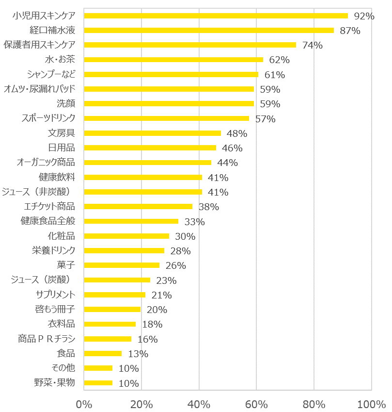 1位は「小児用スキンケア」で92%の医院で配布しやすいと回答しました。2位は「経口補水液(87%)」、3位は「保護者用スキンケア(74%)」、4位「水・お茶(62%)」、5位「シャンプーなど(61%)」、6位「洗顔(59%)」「オムツ・尿漏れパッド(59%)」、7位「スポーツドリンク(57%)」でした。