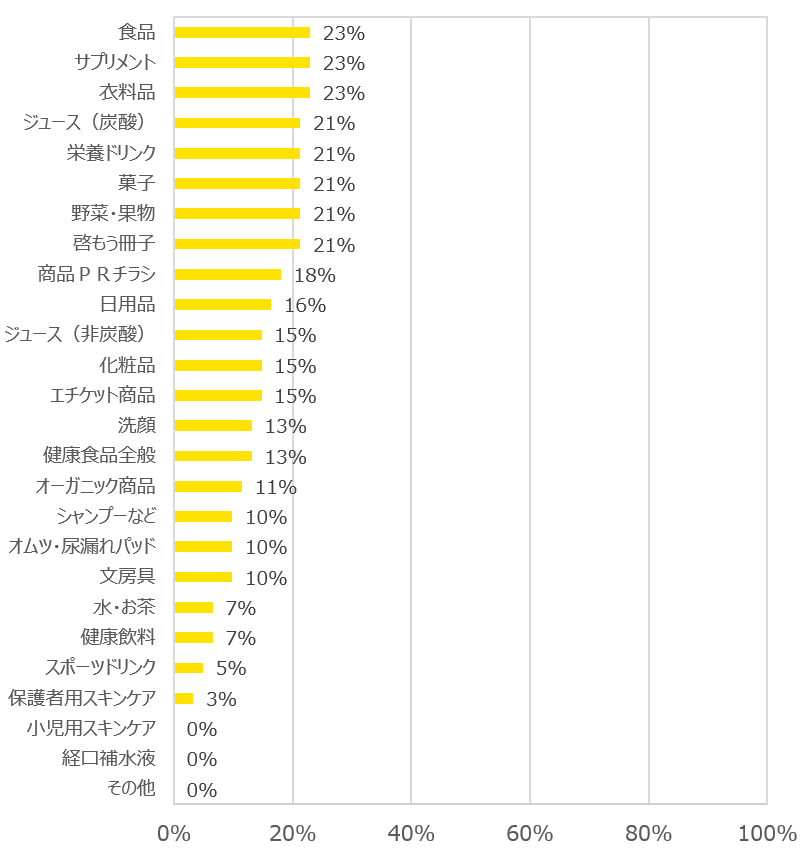 1位は「食品」「サプリメント」「衣料品」で、23%の医院が配布しにくいと回答されました。2位は「菓子」「野菜・果物」「啓もう冊子」で、13%の医院が配布しにくいという回答でした。