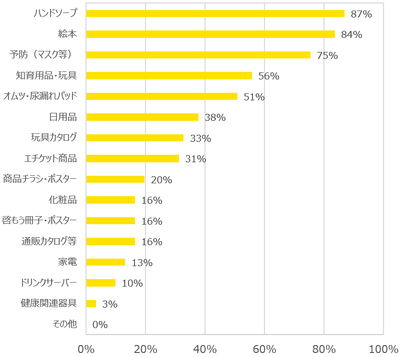 1位は「ハンドソープ(87%)」で、2位が「絵本(84%)」、3位が「予防商品(マスク等)(75%)」、4位が「知育用品・玩具(56%)、5位「オムツ・尿漏れパッド(51%)」という回答でした。