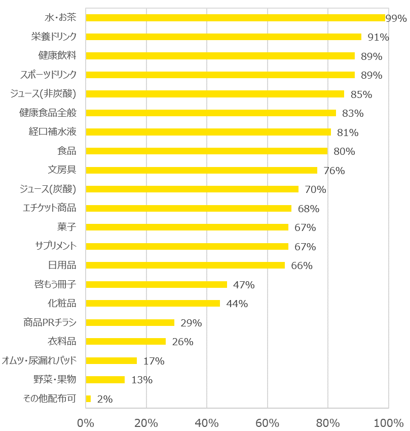 50%を上回った項目のほとんどを食品・飲料が占めた結果となりました。特に飲料については全項目で70%を超える施設が配布可能と回答しており、ある程度ジャンルや商品内容問わず受け入れ可能な施設が多いとの結果が得られました。