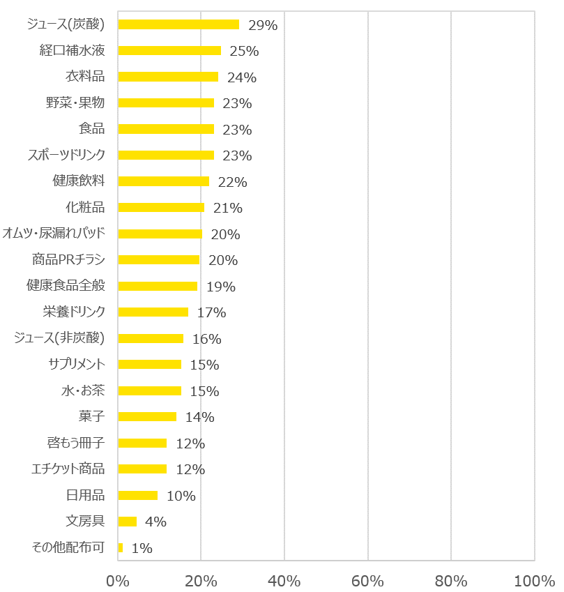 1位は「ジュース(炭酸)(29%)」で、2位は「経口補水液(25%)」、3位「衣料品(24%)」、4位が「スポーツドリンク(23%)」「食品(23%)」「野菜・果物(23%)」という回答でした。