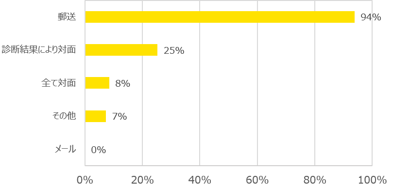1位「郵送での通知(94%)」、2位「診断結果により対面での通知(25%)」ということで、郵送で通知をする施設が大半を占めました。