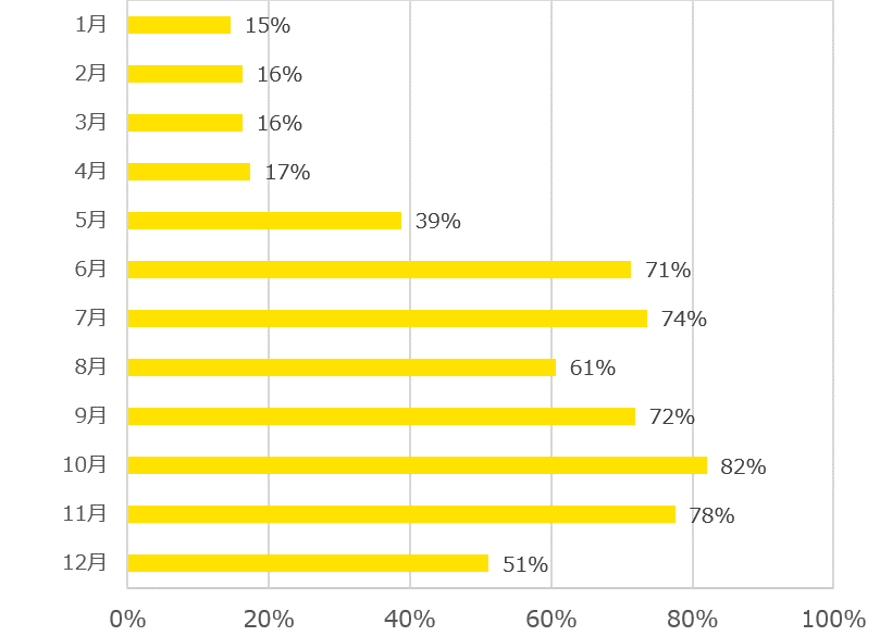 1~4月はいずれも20%に満たず、繁忙期の医院は少ないという結果でした。これは健康診断自体が特に緊急性が高いものではない為、個人の受診者は年末年始の忙しい時期を避けたり、学校や企業の年度替わりとなる3~4月の受診が少ないということが理由と推察されます。