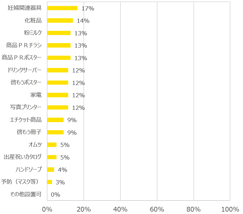 1位は「妊婦関連器具(17%)」で、2位が「化粧品(14%)」、3位が「粉ミルク(13%)」「商品PRチラシ(13%)」「商品PRポスター(13%)」、4位が「ドリンクサーバー(12%)」「啓もうポスター(12%)」「家電(12%)」「写真プリンター(12%)」と続きました。