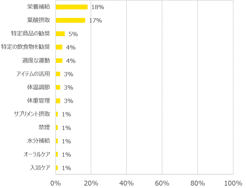 薬以外で妊産婦に健康維持を目的に進めている事・食べ物は、1位「栄養補給(18%)」、2位「葉酸摂取(17%)」という結果でした。一部の医院からは特定商品を勧めているという意見もありました。