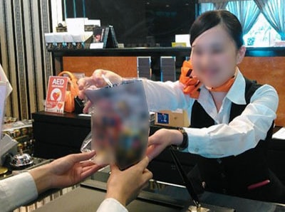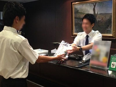 ① チェックイン時に配布ツール(4点セット)を受付スタッフより手渡し配布。
