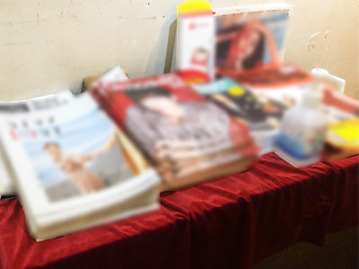 ①レストラン/カフェ: レジ周辺などの店内遊休スペースに販促物を平置きで設置。