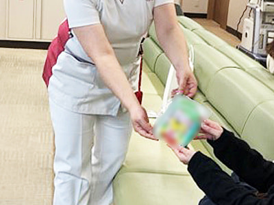 先生、または医院スタッフから妊産婦に配布物3点セットを手渡しで配布。